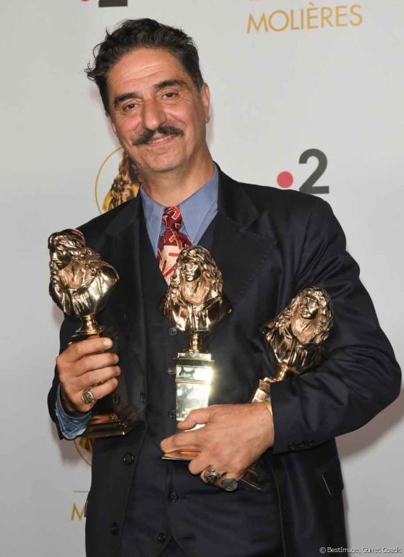 Simon Abkarian, qui a passé son enfance au Liban, arborant ses 3 Molières décrochés en 2020 : Molière de la mise en scène d'un spectacle de Théâtre public, Molière de l'auteur francophone vivant et Molière du Théâtre public pour la pièce "Électre des bas-fonds".