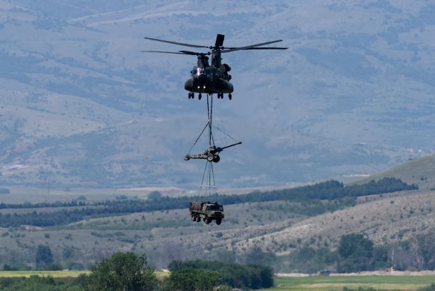 Un obusier 155 mm Otan transporté par un hélicoptère Chinook avec un véhicule tout-terrain Steyr-Puch Pinzgauer de l'Armée britannique.Le Pentagone a précisé qu'elle comprenait notamment 18 obusiers Howitzers avec leurs véhicules de transport et 36.000 obus, ainsi que deux lanceurs de missiles anti-navires Harpoon, destinés à la défense côtière de l'Ukraine sur la mer Noire.