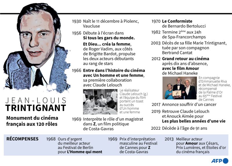 L'acteur français Jean-Louis Trintignant, l'un des plus grands ténors du cinéma français, est décédé vendredi à l'âge de 91 ans dans sa résidence du Gard, dans le sud de la France. Entré dans l’histoire du cinéma avec Un homme et une femme de Claude Lelouch, où il incarne un pilote automobile amoureux d’Anouk Aimée, il a remporté un prix d’interprétation à Cannes pour Z de Costa Gavras en 1969 et un César du meilleur acteur pour Amour (2012) de Michael Haneke, film récompensé d’une Palme d’or.
