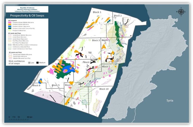 Carte des zones potentielles de prospection pétrolière (source: LPA)1- Quelles informations le Liban détient-il sur le champ potentiel de Cana, dont la majorité se situe dans le bloc 9 ?