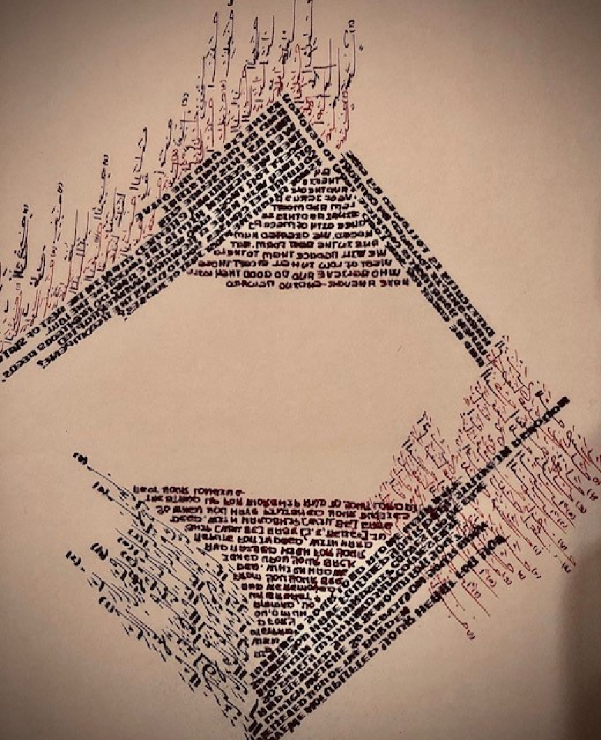 À regarder les œuvres de Fadi Balhawan, on voit des dessins avec des couleurs. À s’en approcher, on discerne des mots. Puis des phrases. On a envie de lire. On pourrait passer des heures à voguer entre les lettres et leurs mots. L’idée est stimulante. On lirait tout le livre durant des heures sur le dessin de l’artiste, ou alors on irait se procurer le livre original qu’on lirait chez soi.