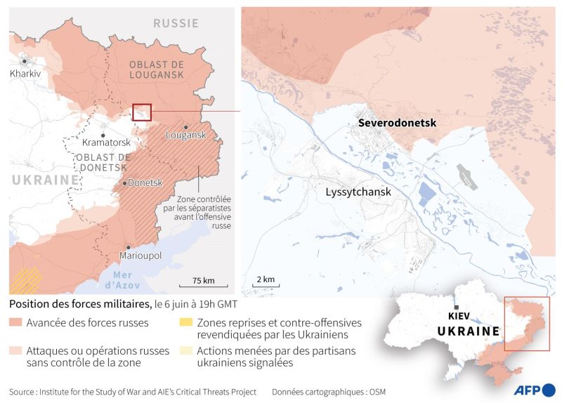 Sur le terrain, les forces russes ont accentué mercredi leur progression vers Lyssytchansk, ville industrielle stratégique de l'est de l'Ukraine. Selon le lieutenant-colonel Andreï Marotchko, représentant des séparatistes prorusses combattants au côté des troupes de Moscou, les forces ukrainiennes sont désormais cernées dans deux villages supplémentaires situés à quelques kilomètres de Lyssytchansk et de sa ville jumelle Severodonetsk.