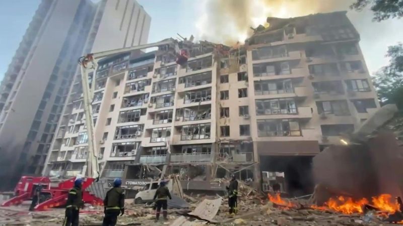 Plusieurs explosions ont retenti à l'aube dans la capitale ukrainienne, épargnée par les bombardements russes depuis début juin. Dans un quartier principalement résidentiel mais qui compte aussi une usine d'armement, une équipe de l'AFP a vu les trois derniers étages d'un immeuble en feu, sa cage d'escalier détruite.
