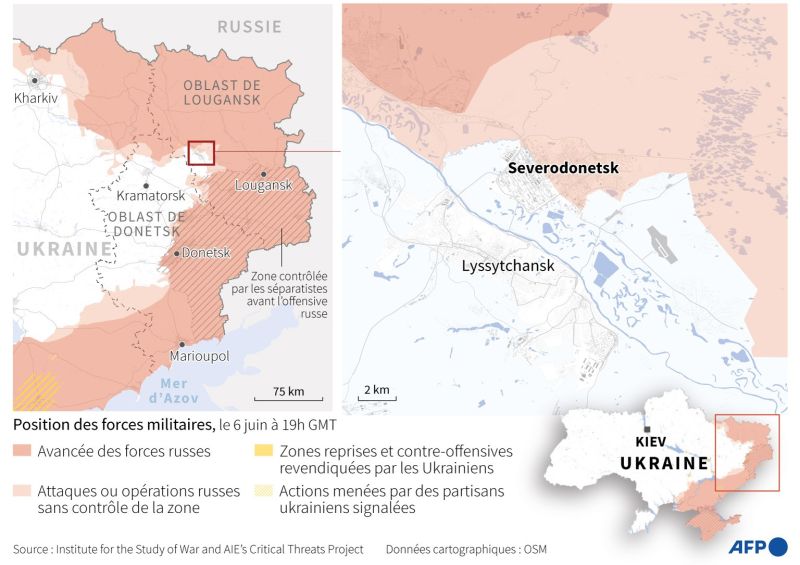 Samedi matin, l'état-major général ukrainien avait affirmé avoir repoussé une offensive des Russes à quelques kilomètres à l'ouest de Lyssytchansk, alors que la veille, Volodymyr Zelensky reconnaissait que la situation demeurait "extrêmement difficile" sur place pour les forces ukrainiennes.