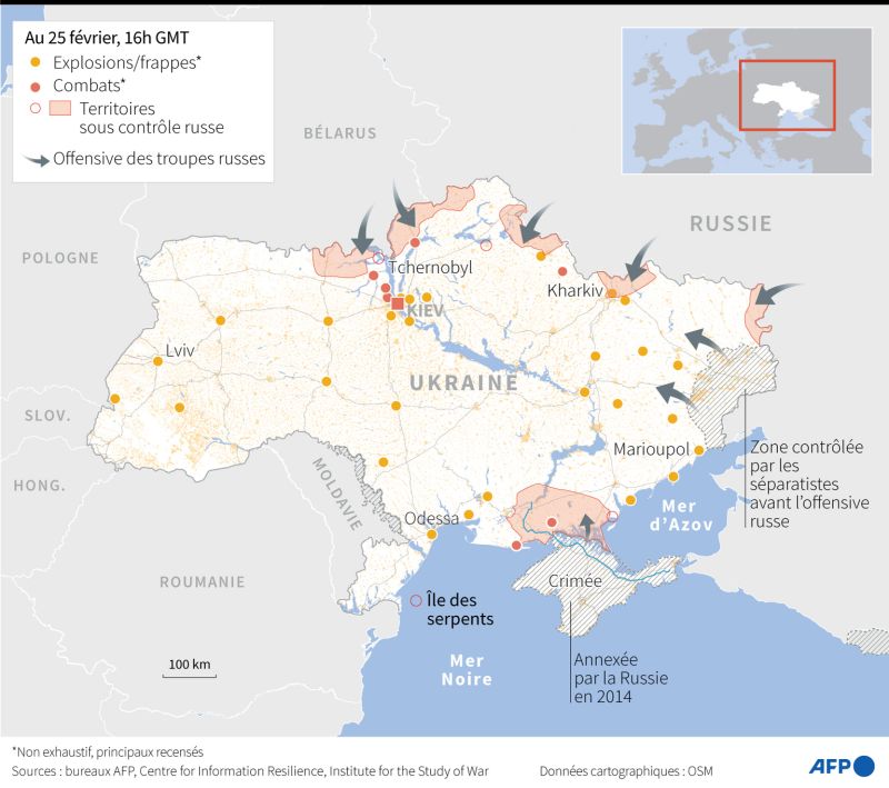 Cette carte montre les différentes offensives russes au deuxième jour de l'invasion de l'Ukraine. Deux offensives majeures ont eu lieu au nord du pays à partir du Bélarus. Moscou et Minsk avaient auparavant amassé des troupes à la frontière ukrainienne en prétextant qu'ils réalisaient des exercices militaires.Le président bélarusse Alexandre Loukachenko a déclaré samedi que son armée a intercepté et abattu des missiles tirés depuis l'Ukraine. Loukachenko a également menacé de riposter à l'avenir, alimentant les spéculations d'une implication croissante de cet allié de Moscou dans le conflit avec l'Ukraine.