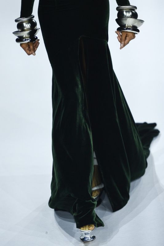 C'est surtout l'émotion d'un artiste, dans le noir, avant de s'exposer au jugement de la salle qui traverse le show. "Je voulais faire vivre l'expérience aux invités, au même endroit qu'était Barbara". Le mannequin fétiche de Stéphane Rolland, l'Espagnole Nieves Alvarez, en combinaison courte et cuissardes cachées sous un grand manteau noir, donne le "la" en ouvrant le défilé.