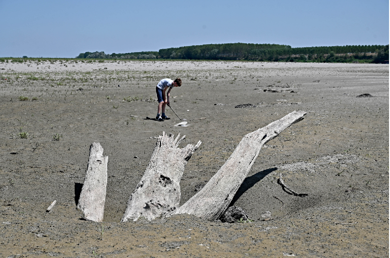Un garçon joue avec un bâton en bois sur le rivage asséché du fleuve Pô dans le village de Ficarolo.Infrastructures vétustes