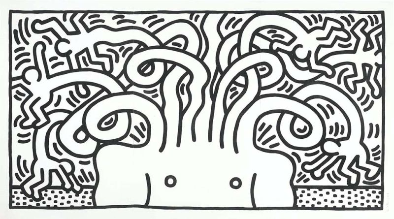 Keith Haring, Medusa Head, 1986.Une image stylisée de la Gorgone sert de logo au couturier et designer italien Gianni Versace qui met en avant la dangereuse attraction de Méduse. À la demande de Gianni Versace, le peintre américain Frank C. Moore (1933-2002) la représente dans le tableau To Die For (1997), sous la forme d'une tête coupée qui, sous les traits du mannequin britannique Kate Moss, apparaiit sur un sol taché de sang. Méduse gît à côté d'une bouteille de parfum Gucci et une photo Polaroid montrant le moment de la décapitation. Se présentant comme une allégorie des relations complexes entre l'art et la mode, le tableau fait également signe vers le destin tragique des créateurs Gianni Versace et Maurizio Gucci, tous deux assassinés.