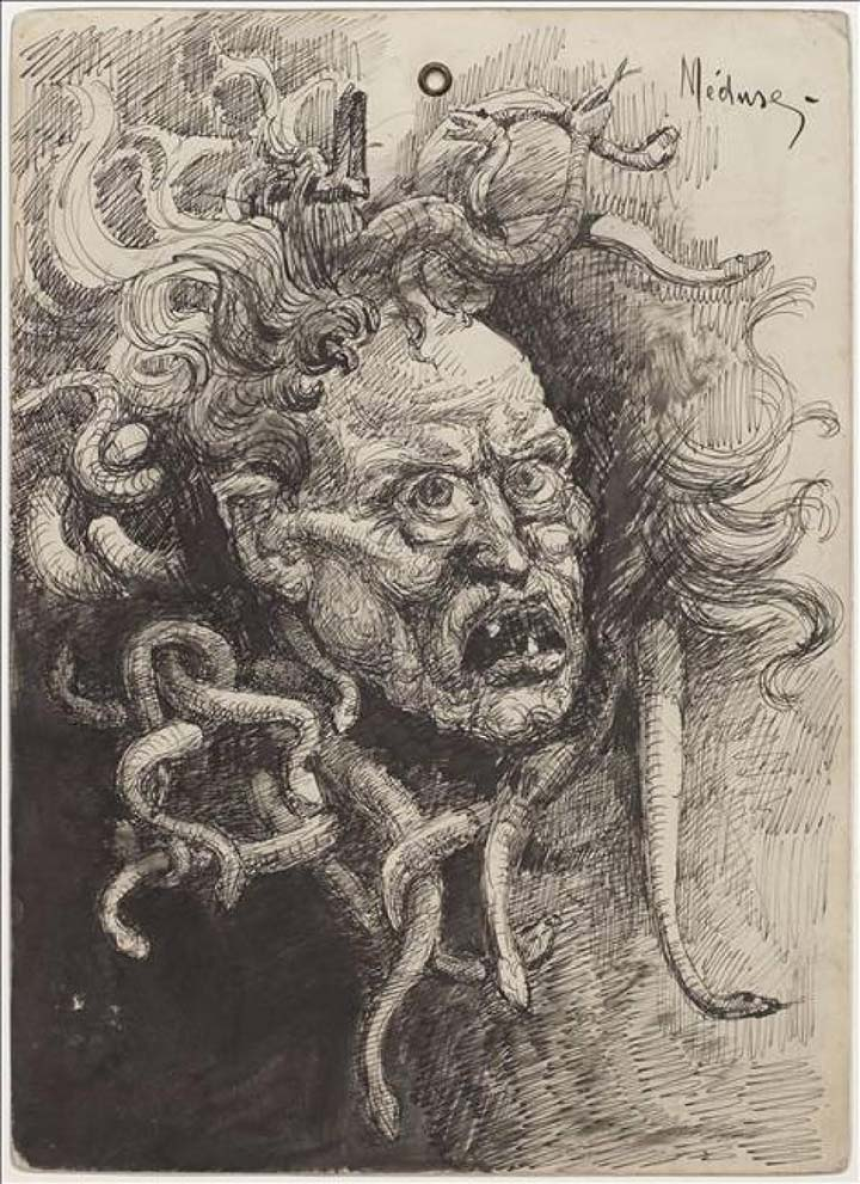 Antonio Canova, Persée brandissant la tête de vénus, 1804, marbre, 242,6 cm, The Met Museum, New YorkUn mouvement de réhabilitation se développe toutefois avec l'école préraphaélite en Angleterre: c'est de l'empathie que Dante Gabriel Rossetti éprouve pour le drame intérieur de la femme et qu'il exprime dans le tableau Aspecta Medusa (1867). Auguste Rodin intègre Méduse dans le groupe La Porte de l'Enfer (1888). Arnold Böcklin la représente vers 1890, puis Carlos Schwabe (1895) et Gustav Klimt (1902). La même année, Camille Claudel crée Persée et la Gorgone. Dans L'Esprit a combattu le mal (1904), Paul Klee inverse les représentations traditionnelles en dessinant Persée de face avec un visage terrible, alors que Méduse est montrée de profil et en plus petit format. Antoine Bourdelle réalise en 1925 une Tête de Méduse, puis Alberto Giacometti en 1935. Le sujet inspire aussi Salvador Dalí (1964).
