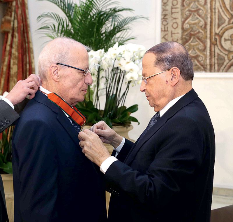 Élie Choueiri recevant les insignes de commandeur de l'ordre national du Cèdre du Président Michel Aoun. Photo Dalati et Nohra