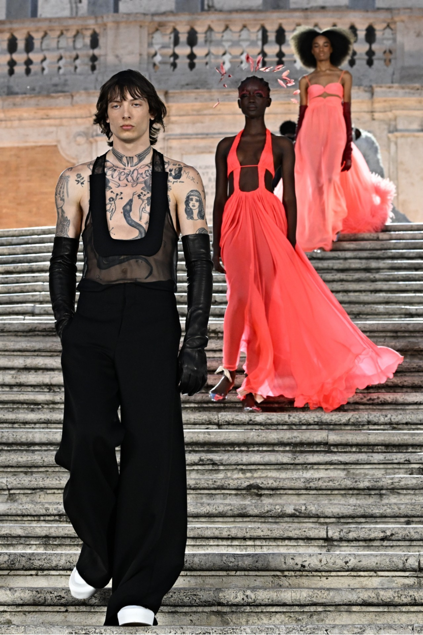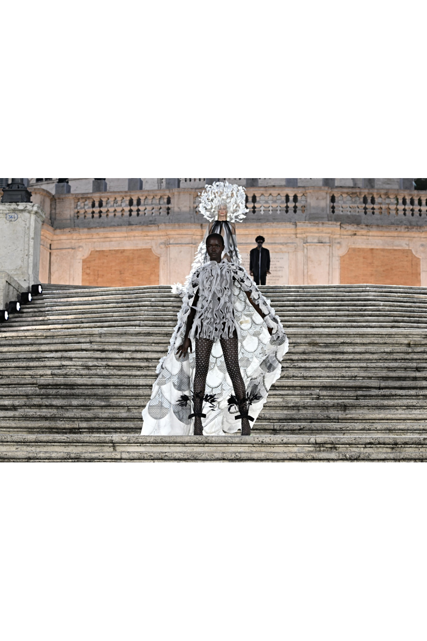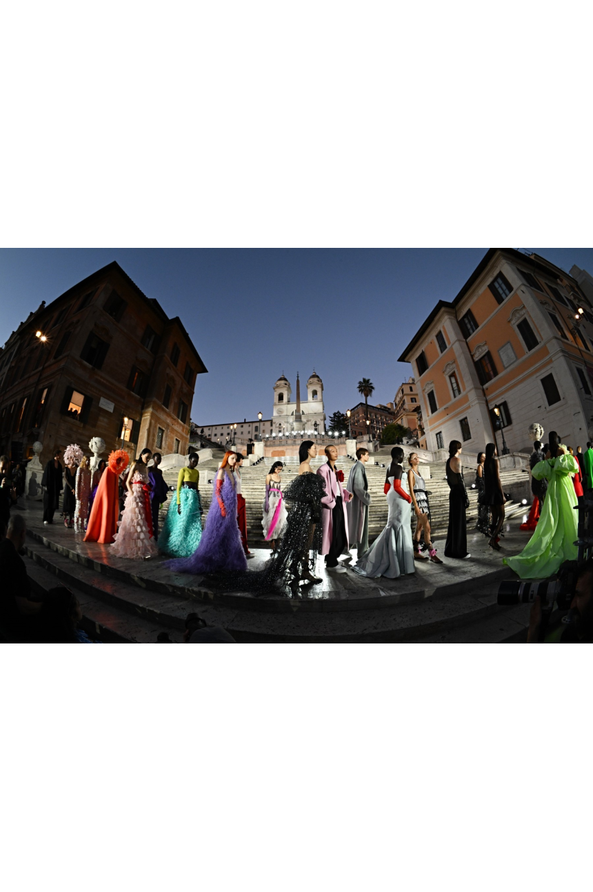 Le palais Mignanelli situé sur la place d’Espagne en est encore le quartier général et le siège des ateliers qui fabriquent méticuleusement depuis plus de 60 ans les créations de la maison. L’Église de la Trinité des Monts, les palais historiques, les palmiers baignés par la lumière dorée ont donc fait office de décor somptueux au spectacle qui a envahi non seulement la place d’Espagne, mais le quartier entier avec une passerelle longue de 600 mètres qui parcourait les rues alentour.
