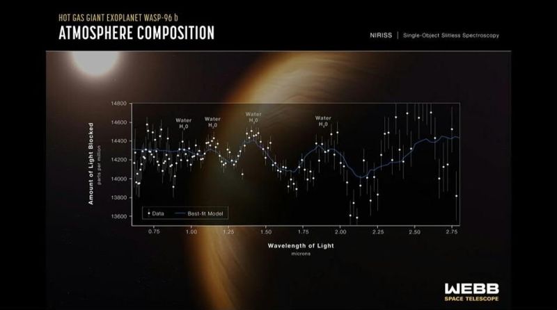L'analyse de la lumière traversant son atmosphère lorsqu'elle passe devant son étoile a permis d'y trouver la présence d'eau, a déclaré la Nasa. Le prédécesseur de James Webb, le télescope spatial Hubble, avait déjà détecté de l'eau dans l'atmosphère d'exoplanètes par le passé, mais l'observation de James Webb est bien plus détaillée.