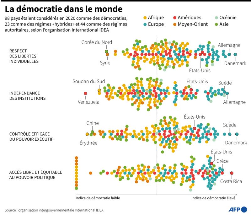 "Seules quatre personnes interrogées sur dix (41,4%), en moyenne dans les pays de l’OCDE étudiés, font confiance à leur gouvernement national", écrivent les auteurs du rapport 2021, qui indiquent également que 41,1% ne leur font pas confiance. "La majorité des personnes interrogées font confiance aux tribunaux et à la police (67,1%, le mieux perçu) de leur pays, tandis que la cote des partis politiques (24,5%, le moins bien perçu), des institutions législatives, comme le Parlement et le Congrès, et des médias est relativement basse", complètent-ils.