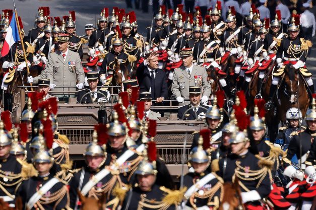 Le président Macron et son chef d'Etat major entourés de la Garde républicaine.Au total, quelque 6.300 personnes ont défilé cette année, dont près de 5.000 à pied, devant une foule compacte tout le long du cortège. Le spectacle a mobilisé 64 avions, un drone, 25 hélicoptères, 200 chevaux et 181 véhicules motorisés.