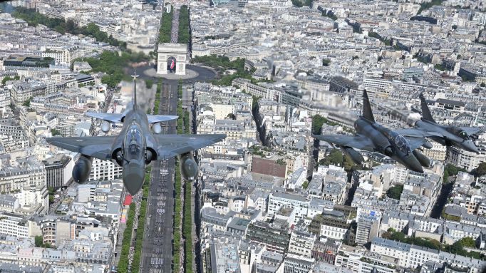 Des Mirages 2000 flanqués de Rafales font partie du défilé aérien.Paris y a nettement renforcé ses missions de réassurance depuis le début de la guerre. Quelque 500 soldats français ont été dépêchés d'urgence fin février en Roumanie dans le cadre de l'Otan et Paris se dit prêt à augmenter son contingent si besoin.