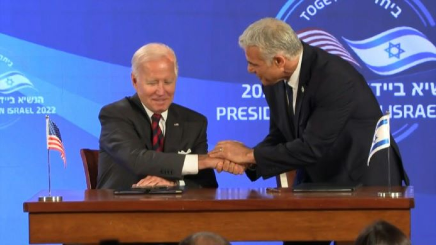 À l'occasion de sa première visite au Moyen-Orient, Joe Biden a signé avec le Premier ministre israélien Yaïr Lapid la "Déclaration de Jérusalem sur le partenariat stratégique entre les États-Unis et Israël", consacré en partie au dossier du nucléaire iranien. Selon ce texte, les États-Unis "s'engagent à ne jamais permettre à l'Iran d'acquérir l'arme nucléaire et à utiliser tous les éléments de leur puissance nationale pour s'en assurer".