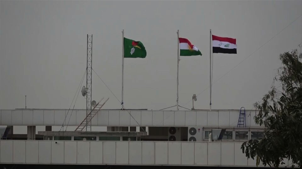 Des drapeaux de (de gauche à droite) de l'UPK, du Kurdistan et de l'Irak hissés à Kirkouk. (AFP)Mais il a lancé début juin deux actions en justice, dont une contre le ministre du Pétrole, Ihsan Ismaïl, qu'il accuse de chercher à "intimider" les entreprises étrangères opérant au Kurdistan, selon un communiqué.