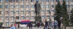 Sur la place centrale de la ville de Slovyansk, la statue de Lénine trône toujours devant le siège du Conseil municipal. Slovyansk est en partie occupée par les séparatistes prorusses qui réclame le rattachement de leur "république populaire de Donetsk" à la Russie. Le drapeau rouge-bleu-noir au fond est celui de leur ...